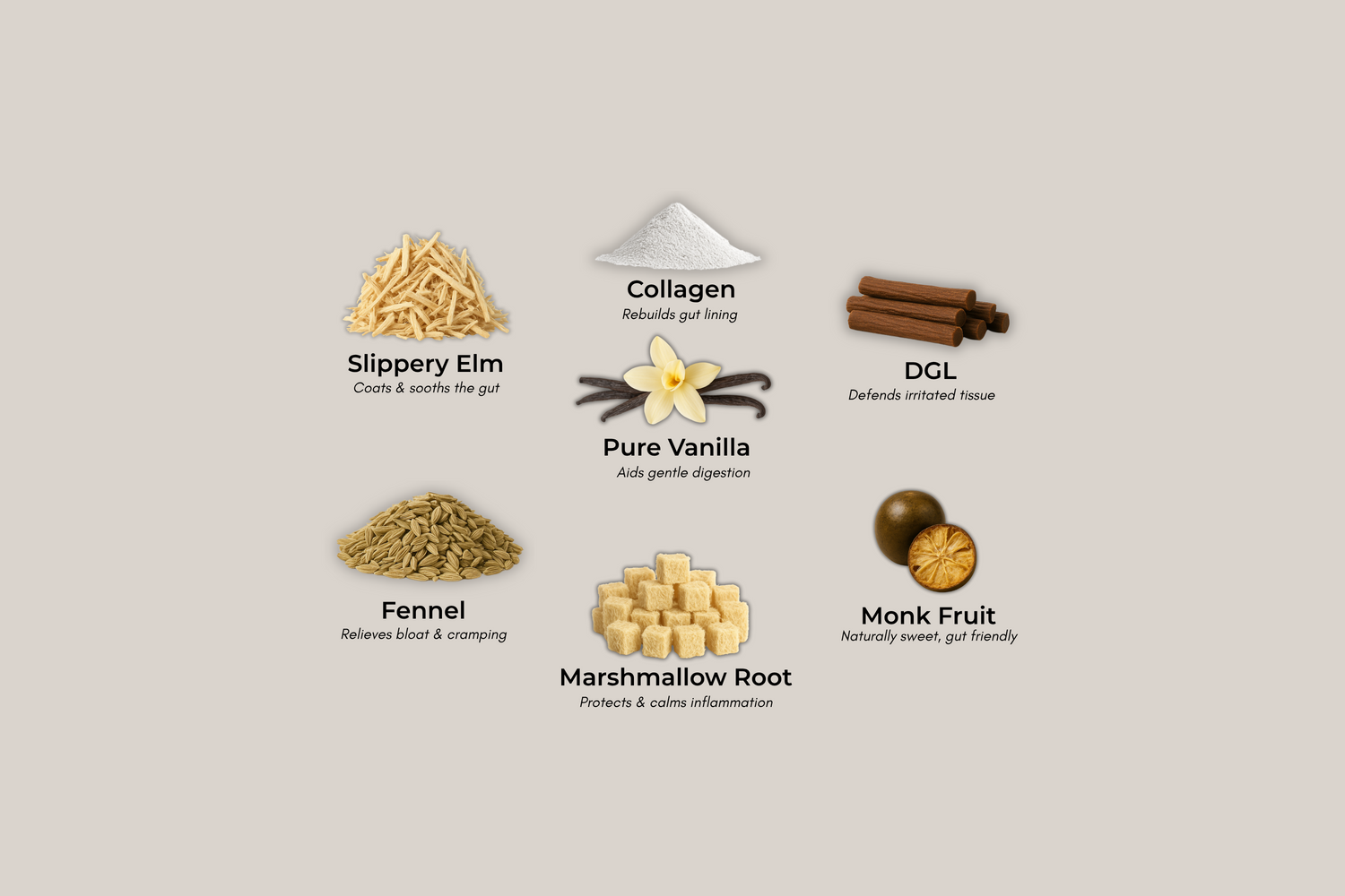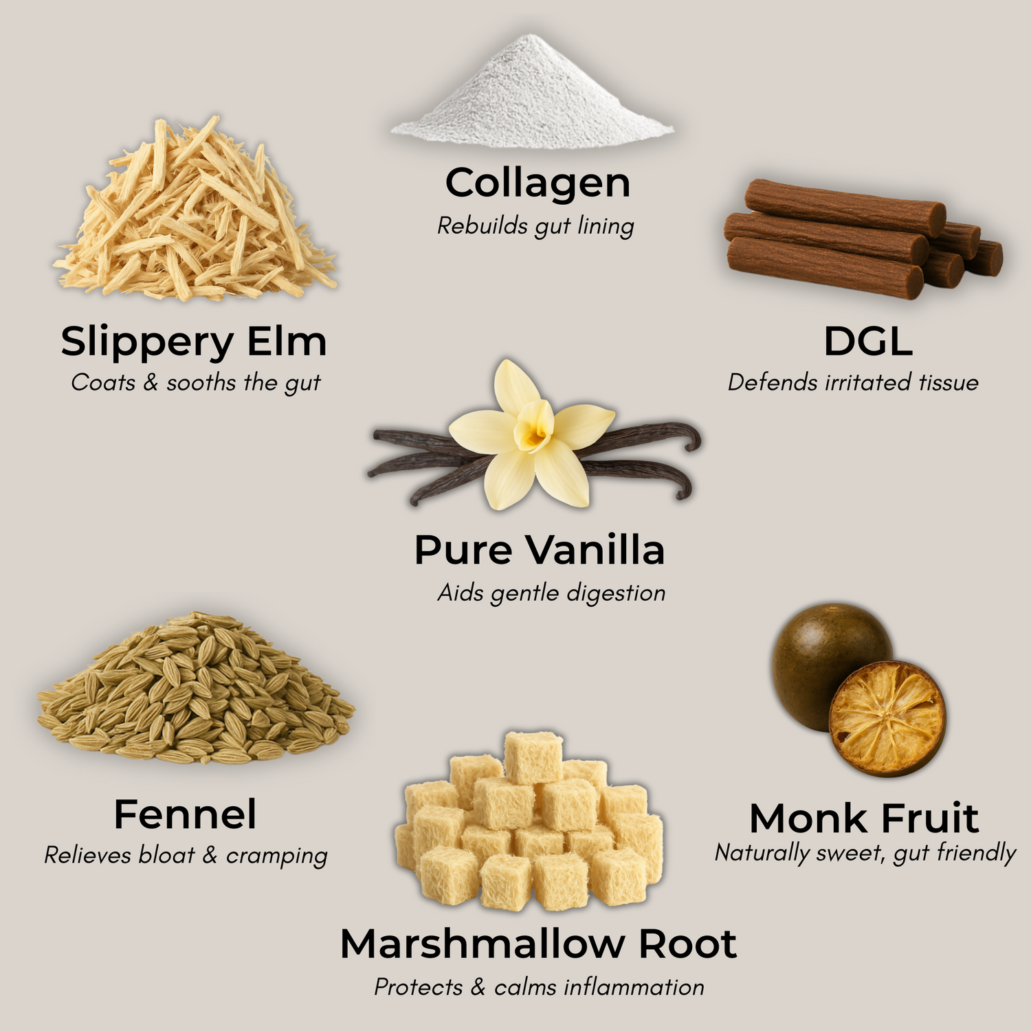 Whether it’s acid, inflammation, ulcers, or irritation—these ingredients go beyond surface-level relief. They help calm the chaos and actually support your gut lining so you can start healing for real: